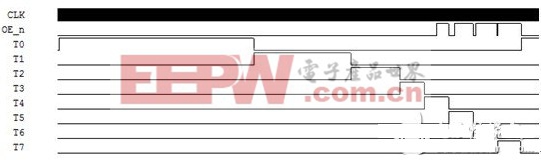 以下介绍如何对R进行灰度控制,G,B的灰度控制原理是类似的。8T对应8bit灰度值的最高位R[7],其刷新的时间长度为8T;4T对应8bit灰度值的次高位R[6],其刷新的时间长度为4T……1/16T对应最低位R[0],其刷新的时间长度为1/16T.如图8所示, R[7]在T0周期送出,R[6]在T1周期送出,R[5]在T2周期送出……R[0]在T7周期送出。