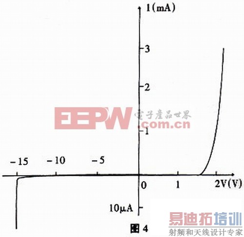 7)V-I特性:发光二极管的电压与电流的关系可用图4表示。在正向电压正小于某一值(叫阈值)时,电流极小,不发光。当电压超过某一值后,正向电流随电压迅速增加,发光。由V-I曲线可以得出发光管的正向电压,反向电流及反向电压等参数。正向的发光管反向漏电流IR10μA以下。