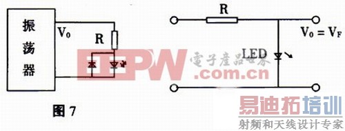 (3)单LED电平指示电路。在放大器、振荡器或脉冲数字电路的输出端,可用LED表示输出信号是否正常,如图7所示。R为限流电阻。只有当输出电压大于LED的阈值电压时,LED才可能发光。