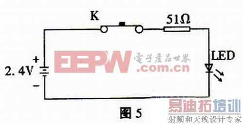 (1)利用高亮度或超高亮度发光二极管制作微型手电的电路如图5所示。图中电阻R限流电阻,其值应保证电源电压最高时应使LED的电流小于最大允许电流IFm.