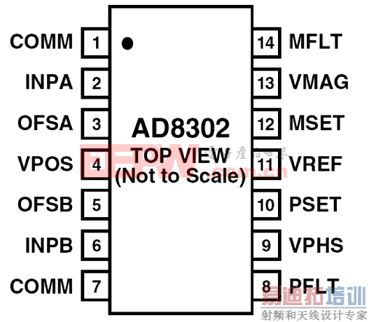AD8302是ADI公司生产的用于正弦波幅值和相位测量的集成电路,其内部由精密匹配的两个宽带对数检波器、一 个相位检波器、输出放大器组、一个偏置单元和一个输出参 考电压缓冲器等部分组成,能同时测量从低频到2.7GHz频 率范围内的两输入信号之间的幅度比和相位差。工作电压2.7V~5.5V,输入信号幅值动态测量范围±30dB,相位测量 范围-180°~180°。对于50Ω的典型测量系统,幅度测量灵