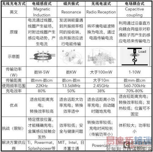 各种无线充电方式都有各自的特点,具体比较如表1所示。
