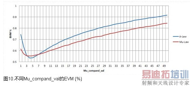 使用了各种Mu_compand_val值进行压缩和解压缩。图10显示了Mu_compand_val与EVM对比曲线,以蓝色表示A率,红色表示Mu率。较大的Mu值将指数增加的采样数映射为同样的指数,对于64QAM数据,其结果非常差。进行一次简单量化,Mu_compand_val=255时,EVM较差。与ITU建议相比,显然需要很浅的指数/扩展比。