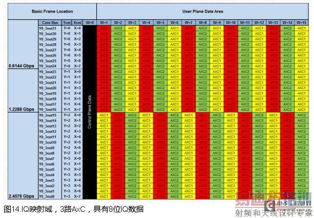CPRI标准提供了帧结构和通用方法,映射CPRI帧中的IQ数据,但是并没有严格的标准,供应商实现了各种不同的方法。由于可以使用不同的位宽度,因此,CPRI压缩增大了难度。IQ映射器的实现比较独特,每家供应商都为这一模块开发了定制RTL。Altera开发的工具极大的简化了这一过程。该工具基于Excel,其中,可以选择曲线斜率,然后,针对每一IQ采样,在单元中填入AxC载波。使用填充位,使帧填满。CPRI帧完全填满后,VB宏会为某一映射结构自动生成RTL代码。如果需要多次使用,工具可以用于自动生成几个IQ映射器实例。具有3路AXC载波的IQ映射器,每个有16位I和Q,相似的例子具有8位I和Q,分别如图13和图14所示。工具生成RTL后,代码被附到Altera CPRI megacore IP中,生成完整的CPRI设计。