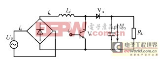 开关电源的功率因数校正器(PFC)可分为两类,一类为有源PFC,由电感电容及电子元器件组成;另一类为无源PFC,一般采用电感补偿方法使交流输入的基波电流与电压之间相位差减小来提高功率因数。在校正电路中有源PFC较多采用高频升压电路功率因数开关调节器,通常采用Boost电路,基本电路拓朴见图1.