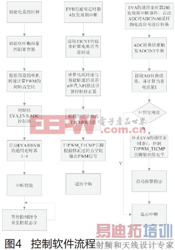 本系统软件采用C语言在TI公司提供的DSP集成编译器CCS3.3环境下编写。根据系统总体设计可知,系统软件需要根据所设定的转速,控制DSC输出相应的PWM信号,并实时监控电机的实际转速。根据检测到的转速,计算出实际转速与预设转速的误差。然后根据这个误差,采用增量PI算法,得出PWM控制信号的修正量,实时修正PWM信号的占空比,使直流电机的转速迅速达到设定的转速并保持稳定。与此同时,DSC还要通过ADCINA0通道,定时检测流入直流电机的电流值,当该电流超出电机的额定电流时,立即关闭PWM输出,停止向直流电机供电,防止因工作在过流状态而烧毁电机。软件流程如图4所示。