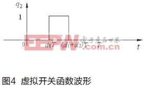 由于在一个开关周期内,电路存在三种拓扑,仅用q1开关函数无法将三种拓扑统一到一组状态方程中去。这里引入虚拟开关S2,它对应着二极管VD的状态,对应的开关函数为q2。当VD导通时,q2(t)=1,当VD关断时,q2(t)=0,波形如图4所示。则变换器的时域状态空间方程为: