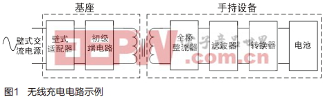 无线充电是通过使用空芯(air-core)变压器来实现的。初级绕组位于充电板,次级绕组位于设备本身。充电板在次级绕组感应出电流,此电流通过手持设备内的全桥整流器及额外电路,产生直流电压来为电池充电。图1显示了无线充电电路的框图示例。基座采用标准壁式插座供电。一旦手持设备置于基座上,电池就开始充电。