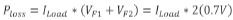 当二极管1和3正向偏置时,二极管2和4反向偏置,反之亦然。因此,整流桥的主要功率损耗就是两个二极管上的正向压降。标准二极管的压降约为0.7V。这表示两个二极管的功率损耗为: