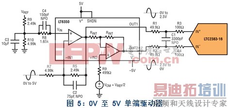 如果需要较宽的输入范围,那么可以驱动 LT6350 的负输入,从而允许由 LT6350 的第一级衰减输入电压。图 5 所示电路将 0V 至 5V 单端信号转换为 ±2.5V 的差分信号,该差分信号驱动 LTC2383-16 的输入。这个电路的输入阻抗等于 R7。增大 R7 的值会提高输入阻抗,从而使驱动更加容易。这么做的代价是,如果 R7 增大到高于 4.99k,那么噪声和失真会略有提高,如表 1 所示。