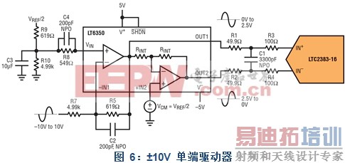 有些传感器提供高于和低于地的输出电压。图 6 所示电路将 ±10V 的地参考单端信号转换为 ±2.5V 差分信号,该差分信号驱动 LTC2383-16 的输入。输入阻抗仍然由 R7 设定。表 2 显示了图 6 电路的噪声和失真随输入阻抗的变化。