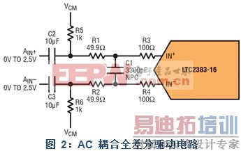图 1 中的电路可以是 AC 耦合的,以在必要时,使 ADC 输入的共模电压与传感器相匹配。只需通过一个 1k 电阻器将AIN+ 和 AIN– 偏置到 VCM (VCM=VREF/2)、通过一个 10µF 电容器将传感器输出耦合到AIN+ 和 AIN– 即可,如图 2 所示。