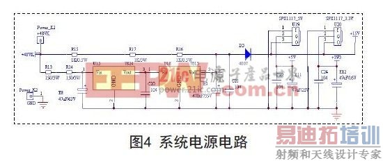本控制系统的电源由4块12V大容量铅蓄电池串连后提供48V直流电,而系统中的工作电压还有+3.3V.+5V和+15V,因此采用常用的稳压电源芯片LM7824.LM7815.1117-3.3和1117-5产生所需各组电压,具有可靠.稳定.简单的特点.如图4所示.