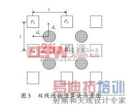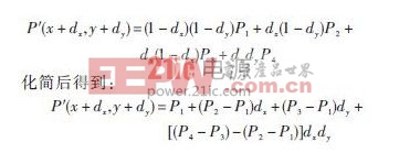 如图3所示,假设原始图像中的某点 (x,y) ,则相邻的右侧和下方像素点位置为 (x + 1,y),(x,y + 1), (x + 1,y + 1),假设它们的灰度值分别是P1,P2,P3,P4,在水平方向和垂直方向上的位移都是单位1,并假设待插入点的位置坐标为:(x + d ) x ,y + dy .