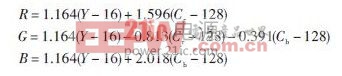实现伪彩处理,通常是把当前像素灰度值作为存储地址查找RGB 伪彩码表,将码表中对应的RGB 三色值用RGB转换到YcbCr彩色区间,而后输出伪彩图像.在FPGA里实现的基本方法是最大限度地利用FPGA的IP核,将RGB码表写到FPGA的内嵌RAM核里,在程序中依次遍历查找表和计算下面的公式计算出相应的CbCr值并且输出.