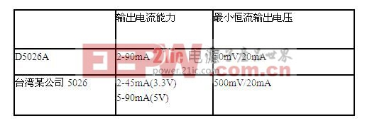 得倍电子D5026A在3.3V或5V电压下电流输出可控范围是2-90 mA,而台湾公司5026输出电流在3.3V下可控的范围是2-45 mA,5V电压下可控的范围是5-90 mA.对于20 mA下的压降来看,D5026A是50 mV,对比公司是500 mV.