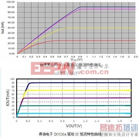 下图是台湾一家公司的5026驱动芯片与得倍电子D5026A的对比。在输出驱动电流典型值 IOUT=20mA 的状况下,台湾公司的5026驱动芯片VOUT约为500mV,而D5026A的VOUT约为50 mV,为台湾公司5026芯片的10%.也就是说,在芯片发热部分,得倍D5026A的发热只有台湾公司5026驱动芯片的10%.