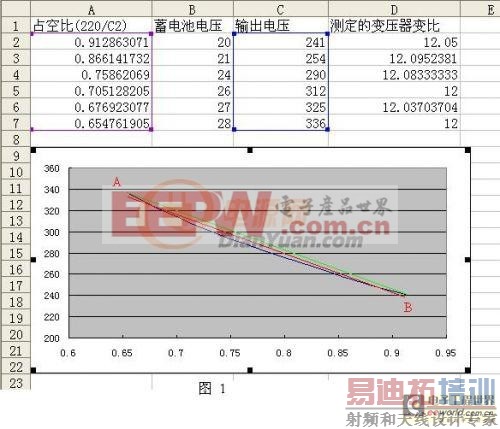 为了输出稳定电压必须使调整占空比k=220/峰值电压(C列),图1为占空和峰值电压的曲线,反比例曲线(蓝色线),由于占空比变化很小,有效值电压就变化很大,可以近似看做一条直线,图1 AB绿色直线,有AB两点做直线方程得出 峰值电压——占空比的线性方程:
