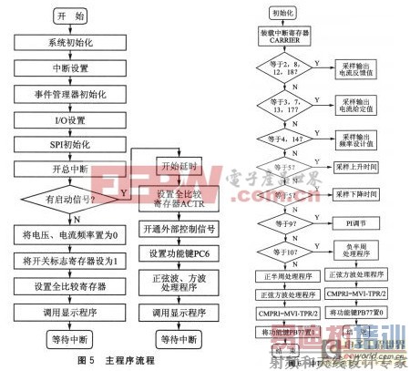 软件程序设计是逆变控制电路设计的核心。本系统软件主要包括:主程序、中断服务程序、PI调节程序、显示程序等。图5为主程序流程,图6为中断程序流程。在主程序中,完成DSP系统及外部设备初始化,I/O控制信号管理及正弦波信号产生和处理等。在中断程序中,完成电流、电压检测,PI调节计算,计算恒压频比下的调制度M和频率值,正弦波处理并给比较器CMPRl赋值等。