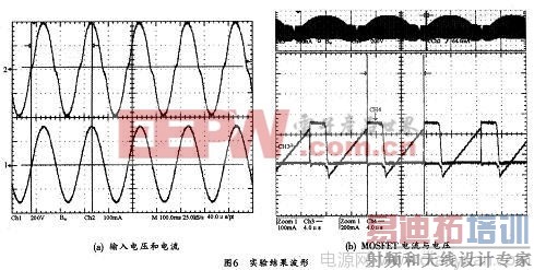 由图6可见,输入电流能良好的跟随输入电压,且电流电压相位差接近于零,故可实现高功率因数的控制。另外,MOSFET的电流是一种高频三角波,其包络为输入电压。由于MOSFET可实现软开关,能有效减小开关损耗。根据测试结果,该电路的PF可达0.998以上,THD在5%以下。