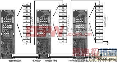 显然,电池管理电路面临着一个非常大的挑战。这些电路必须能快速和准确地测量每节电池的电压。这要求能够从一个0~1000V的共模电压中抽取一个小的差分电压。现在的电池管理系统(BMS)大部分使用现售组件的组合,这些组件以模块化方式排列。如图3所示,一个由36节电池组成的电池组,以12节电池为一组分3组来进行监控。这样做能降低每套模拟电路上的共模电压。由2节电池组成的模块为模拟电路提供局部电源和地,该模拟电路采用LTC6802-1电池组监视器。