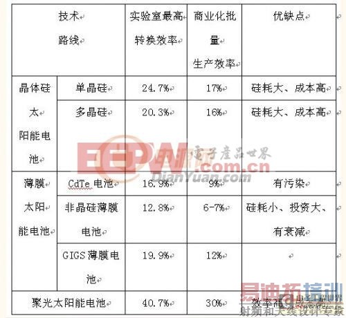 目前在用的光伏发电技术主要有三种:晶体硅太阳能电池、薄膜太阳能电池和聚光太阳能电池,其中晶体硅电池应用最广泛,占80%以上;薄膜电池近年增长迅速,占10%以上;聚光太阳能电池有少量应用。在这3种光伏发电技术中,晶体硅电池的优点是转换效率较高、占地面积小,缺点是硅耗大、成本高,比较适于城市地区;薄膜太阳电池的优点是硅耗小、成本低,缺点是转换效率低、投资大、衰减大、占地面积大,比较适于偏僻地区的并网电站和建筑光伏一体化;聚光电池的优点是转换效率高,缺点是不能使用分散的阳光、必须用跟踪器将系统调整到与太阳精确相对,目前主要用于航天航空。预计未来光伏发电将呈现多种技术并存,共同努力降低成本的局面。