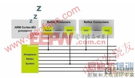 图4:使用一个互连矩阵或“外围设备反射系统”可以执行简单的任务。在电源预算中加密