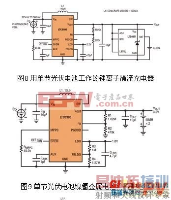 在很多情况下,充电速率与另一个重要因素“周期寿命”成正比。存储组件的周期寿命决定该组件不用维护可以在现场工作多长时间。一般而言,更快的充电和放电会缩短组件的工作寿命。超级电容器拥有非常长的周期寿命,而用相对较高的电流(电荷》1C)给电池充电会缩短寿命。除了充电和放电速率,每个充电/放电周期的深度也可能影响电池寿命,周期越深,寿命越短。某些类型的电池,尤其是锂离子电池和薄膜电池,最高和最低电压都必须仔细控制。在LTC3105应用中,最高充电电压得到了良好控制,因为当输出进入稳定状态后,转换器终止充电。为了防止过充电,LTC3105可与LTC4071并联电池充电器一起使用,如图8所示。