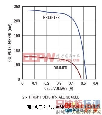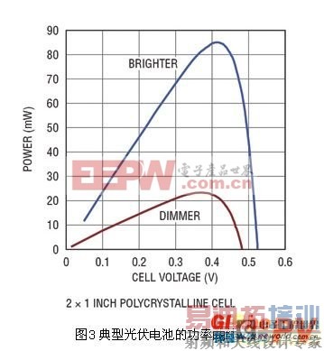 为了从光伏电池抽取最大功率,电源转换器的输入阻抗必须与电池的输出阻抗匹配,从而使系统能在最大功率点上工作。图3显示了一个典型的单节光伏电池的功率曲线。为了确保抽取最大功率,光伏电池的输出电压应该与功率曲线的峰值点相对应。LTC3105 调节提供给负载的输出电流,以保持光伏电池的电压等于最大功率点控制引脚设定的电压。因此可用单个电阻器设定最大功率点,并确保从光伏电池抽取最大功率和峰值输出充电电流。