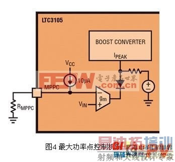 图4显示了LTC3105 使用的最大功率点控制机制的模型。图3显示了光伏电池的功率曲线。请注意,当电池电压上升而离开峰值功率点时,光伏电池的功率就会从峰值点急剧下降。因此,一般更希望低于理想值而不是高于理想值的控制电压,因为功率曲线在高压端下降得更快。