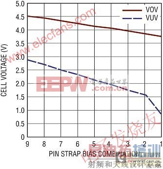 图 3:电池电压报警门限的选择是通过引脚搭接设定的。单独的引脚控制 OV 和 LV 门限,这样它们就可以独立设定。
