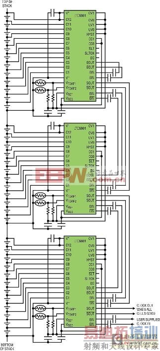 可以将任意数目的 LTC6801 彼此堆叠起来,以监视非常高电压系统中数百个单独的电池,见图 4。启用时钟被缓冲,两条信号线上的输出连接到电池组中下一个较高端器件的使能输入。启用时钟蜿蜒地进出每个器件,一直到电池组的顶端。同样,每个器件非常重要的状态输出时钟向下传递至电池组中下一个较低端器件的状态输入引脚。状态时钟的频率与启用时钟相同,并可位于 2kHz 至 50kHz 之间。如果任何时间在任何电池组的任何地方检测到任何故障,则负责监视受损电池的器件的状态时钟将停止电平变换。该静态条件将沿着电池组向下传播至底端器件。运用某种形式的边缘检测的任何器件 (例如:看门狗定时器或计数器捕获/比较功能部件) 均可用于监视电池组中底端器件的状态输出线。当某个时钟转换被错过时,该器件能够产生信号以对一般性故障进行维修。