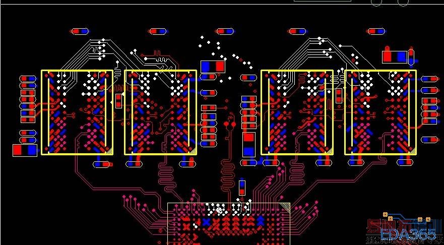 是BGA封装的,地址线从中间出来,白色的是地址线,蓝色的是电源1.5V, 这是原来6层板的截图。
