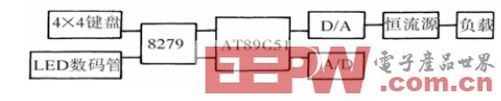 变压整流、单片机控制部分、D/A 与A/D 转换电路、供电部分、显示器或键盘接口电路、恒流源电路等,本数控恒流源便由以上的几个部分组成。该系统还能实现人机交流,主要是通过LED数码管和小键盘来实现的,LED 数码管显示电流值以及一些相对应功能,而小键盘则可以实现人为的来控制恒流源输出,即当未小键盘控制下的状态时,用户的输入状态会被显示,而当为A/D 采样控制时,主要控制部分器件包括:模数转换芯片、键盘显示接口芯片、单片机、驱动芯片、8 位数模砖和芯片等。核心的控制芯片采用AT89C51 通用单片机,主要因为其功能完备、性能较为稳定,具有较低的成本,是首选的小型控制系统核心控制芯片。利用A/D 采样处理交由D/A 输出,可以在键盘与电路之间进行通信,而8279 管理键盘与电路,使得处理器的负担减轻,单片机的口线和时间被显示电路与键盘过多占用的问题,也能够得到结局。系统总体框图(如图1)。