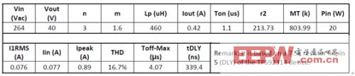 举例:90到264VAC通用AC输入,420mA电流的40V/20 W T8 LED驱动器。在初始设计中,初级侧到次级侧变压器匝数比为3:1,而初级侧电感为460 µH。