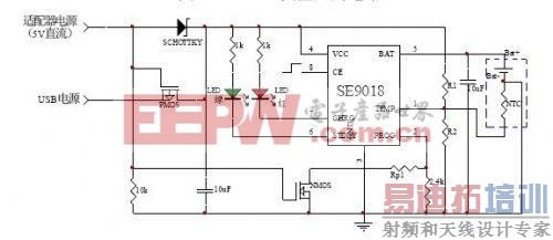 同时,使用SE9018芯片可以实现适用于USB电源和适配器电源的充电电路,电路图如图4所示。