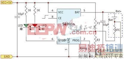 SE9018的其他功能包括手动停机、欠压闭锁、自动再充电等。典型的基于SE9018的锂离子电池充电电路如图3所示。CE端为高电平时,SE9018正常工作。