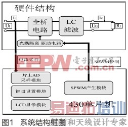 考虑到系统效率,不需要进行boost升压,可以直接逆变。故本系统结构图如图1所示。SPWM信号控制硬件全桥电路,然后经过LC滤波电路可以得到正弦波。以MSP430单片机为核心的数字控制系统需要采样电流量、控制硬件电路系统以及形成良好的人际交互界面。