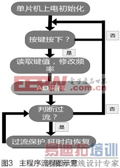 软件结构框图如图1,主程序框图如图3。程序执行的流程如下所述:单片机上电之后,系统进行按键、片上ADC12和LCD显示屏初始化,程序查询按键,若有相应按键按下,修改正弦波频率,然后AD采样电流判断是否过流;否则返回继续查询按键。如果输出过流,程序将关闭SPWM输出,延时自恢复;否则返回按键查询。