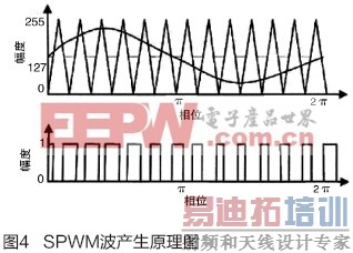 本系统采用自然采样法产生SPWM波,以正弦波为调制波,等腰三角波为载波进行比较,在两个波形的自然交点时刻控制开关器件的通断。其优点是所得SPWM波形最接近正弦波,但由于三角波与正弦波交点有任意性,脉冲中心在一个周期内不等距,从而脉宽表达式是一个超越方程,若采用实时计算的方式得到SPWM波的话,计算繁琐,非MSP430所能胜任。本系统充分利用MSP430的定时器,搭建了一个简易的DDS;让其计数器作增减计数构成三角波载波,再把正弦波表作为数组预先存入MSP430中,我们只需在定时器中断中更新比较寄存器数值即可得到调制正弦波。由于MSP430定时器自带比较功能,两者比较即可得到SPWM波输出,继而撇开了繁琐的超越方程求解。最终我们利用此方法得到的SPWM波滤波后的正弦波失真度达到了0.5%。图4是自然采样原理图。