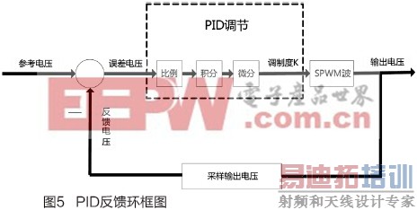 由于输入电压随着负载变大会有降低,切系统滤波电感具有电阻成分,这些因素导致在系统开环下负载调整率较大,因此本系统采用闭环反馈调整输出电压稳定在10V。我们选用经典PID反馈调整,对输出电压进行采样,与参考电压比较得到误差电压后进行位移式PID调节,PID运算输出作为SPWM的调制度K,与正弦波表相乘后形成新的波表进行生成SPWM波运算。用此方法后负载调整率降到了1%以下,图5是反馈过程框图。
