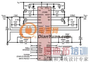 LTC3880/-1能提供高度准确的数字电源系统管理,具高分辨率可编程性和快速遥测数据回读,可实时控制并监视关键的负载点转换器功能。该器件是一款双输出、高效率、同步降压型DC/DC控制器,提供基于I2C并具超过100条指令的PMBus接口和内置的EEPROM。该器件兼有最佳的模拟开关稳压控制器和精准混合信号数据转换,可无与伦比地实现电源系统的易设计性和易管理性,并得到了具易用型图形用户界面(GUI)的LTpowerPlay软件开发系统的支持。图1显示了一个典型的应用原理图。