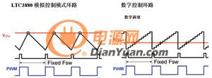 LTC3880/-1是一种数字可编程控制器,可实现很多种功能,如控制输出电压、电流限制设定点和排序,等等,该器件还有一个模拟反馈控制环路,以实现最佳环路稳定性和瞬态响应,且不会产生数字控制环路那样的量化效应。图2显示了一个控制器IC的不同斜坡曲线,该IC具模拟反馈控制环路(LTC3880)和数字反馈控制环路。模拟环路有一个平滑的斜坡,而数字环路像一个阶跃函数,可能导致以下问题:稳定性、较慢的瞬态响应、在有些应用中需要较大的输出电容以及引起较大输出纹波的数字环路量化效应。