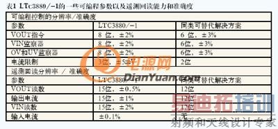 LTC3880/-1的可编程控制参数包括输出电压、裕度调节、电流限制、输入和输出监察限制、上电排序和跟踪、开关频率,以及识别和可跟踪性数据。内置的精准数据转换器和EEPROM允许收集稳压器配置设定值和遥测变量值,包括输入和输出电压及电流、占空比、温度以及故障记录,并对这些设定值和变量值进行非易失性存储。表1显示了一些可用 LTC3880/-1设定的参数、该器件的高分辨率遥测回读能力,以及同类可替代解决方案的分辨率和准确度。