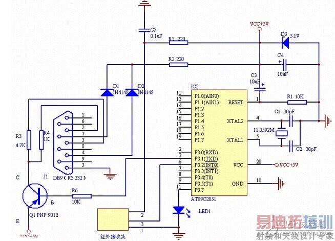 电路基本原理就是通过红外接收头收集红外信号,当有红外信号进来时,单片机AT89C2051($0.5999)执行中断并对采集到的红外信号进行解码,并从串口送到PC,PC软件Girder收到串口发来的字符再根据定义做出相应的命令操作。电路中使用了几个简单的元件做成串口窃电电路,使这个遥控器不需要再外接电源,插到串口上就可以使用了,可以说是即插。安装好后,运行Girder后,指示灯LED1就开始闪烁,表明电路正常工作了,这时就可以使用你的遥控器了,当关闭 Girder后电路板的电源也会被切断,指示灯熄灭。下面是制作过程和具体的一些注意事项等。