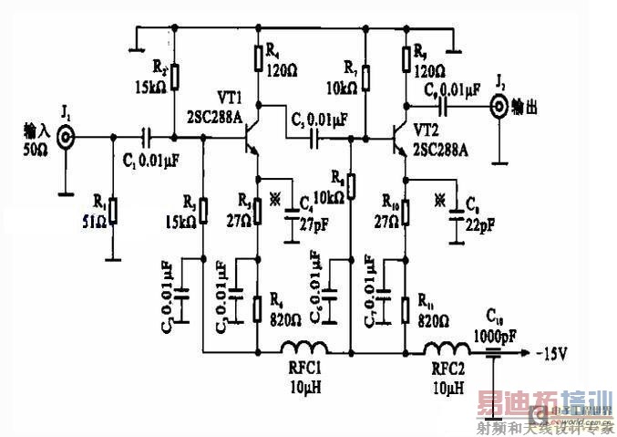 下图所示是由两级共发射极放大器组成的宽频带实用放大器。输入、输出和极间耦合均采用电容方式,C4、cs为发射极去耦电容器,用以消除交流负反馈,增强交流信号放大的能力,接在-15V电源中的电感器(10 yH)和It6、C3、Rii、岛、C2等均为滤波器,用以滤除电源中的波纹。