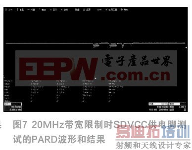 当把数字存储示波器SDS3052设置为20MHz带宽限制时,电源输出变得非常好,完全在供电要求的范围内。如图7所示20MHz带宽限制时的波形和结果。
