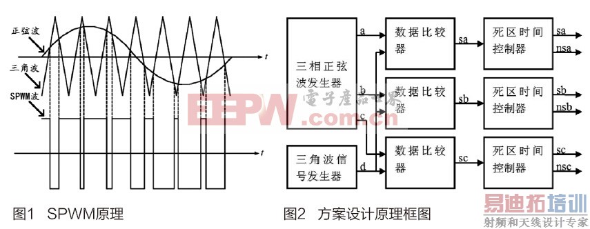 本文设计思想为在FPGA/CPLD内存中分别存储了离散的三角波数据、正弦波数据,再利用DDS技术输出三角波数据和正弦波数据,设计一个数据比较器对以上两种波形数据进行实时比较,如果正弦波数据大于三角波数据,SPWM信号输出高电平,反之则输出低电平。根据以上原理,利用DDS技术产生相位差为120o的三相正弦信号分别与三角波信号进行比较,就能输出三相SPWM波形。