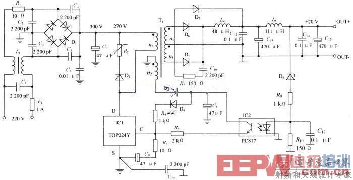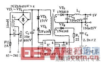 本电源为简单的5V、5W开关电源。图中TOP210(IC)为PWM开关。IC中含有PWM控制器,功率MOSFET和各种保护电路,这种5V、5W开关电源的成本比常用的线性电源成本低。
