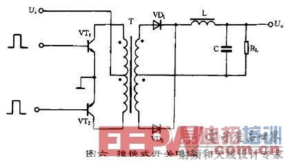 推挽式开关电源的典型电路如图六所示。它属于双端式变换电路,高频变压器的磁芯工作在磁滞回线的两侧。电路使用两个开关管VT1和VT2,两个开关管在外激励方波信号的控制下交替的导通与截止,在变压器T次级统组得到方波电压,经整流滤波变为所需要的直流电压。